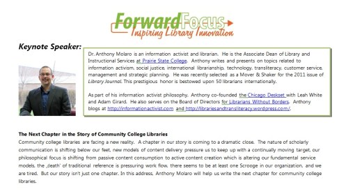 This is a gentle reminder that registration for the 2012 ForwardFocus Conference will be open until Friday, October 26. There is still time to attend this unique conference focusing on community college libraries, a conference that I am honored to be providing the keynote address. The conference will be held on November 2, 2012, both in person at Illinois Central College and across the nation virtually via Blackboard Collaborate. Please see their conference website (http://forwardfocusconference.wordpress.com/).